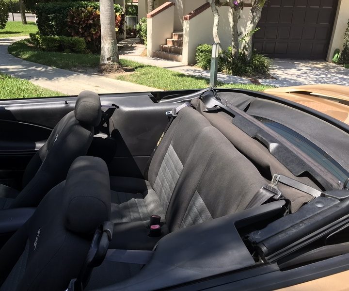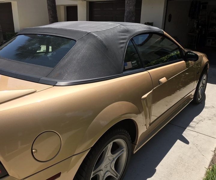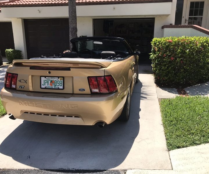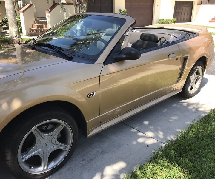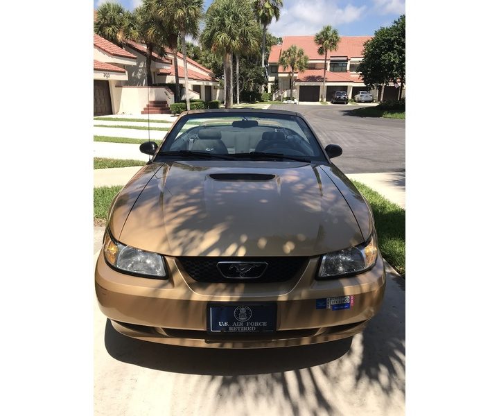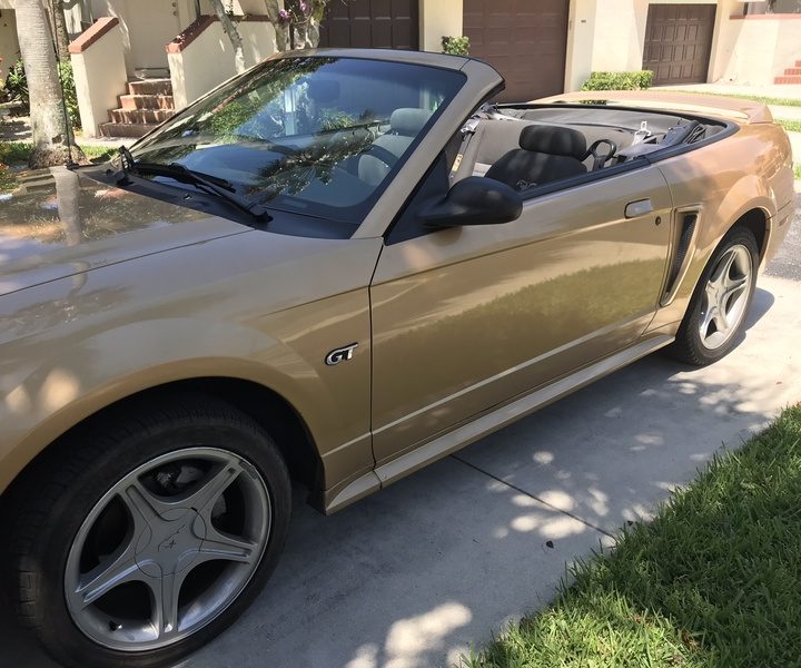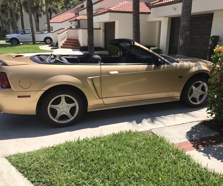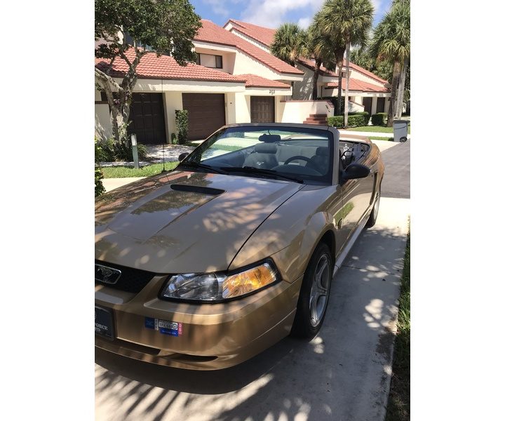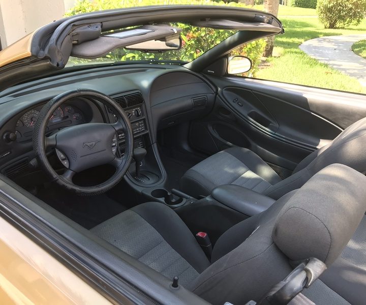 2000 Mustang GT Convertible, 4.6L V8, 97K miles, Sunburst Gold exterior paint, black cloth interior, automatic transmission, power top, power steering, power front disc brakes, power windows, power door locks, AM/FM, console, factory A/C. Located in Florida.